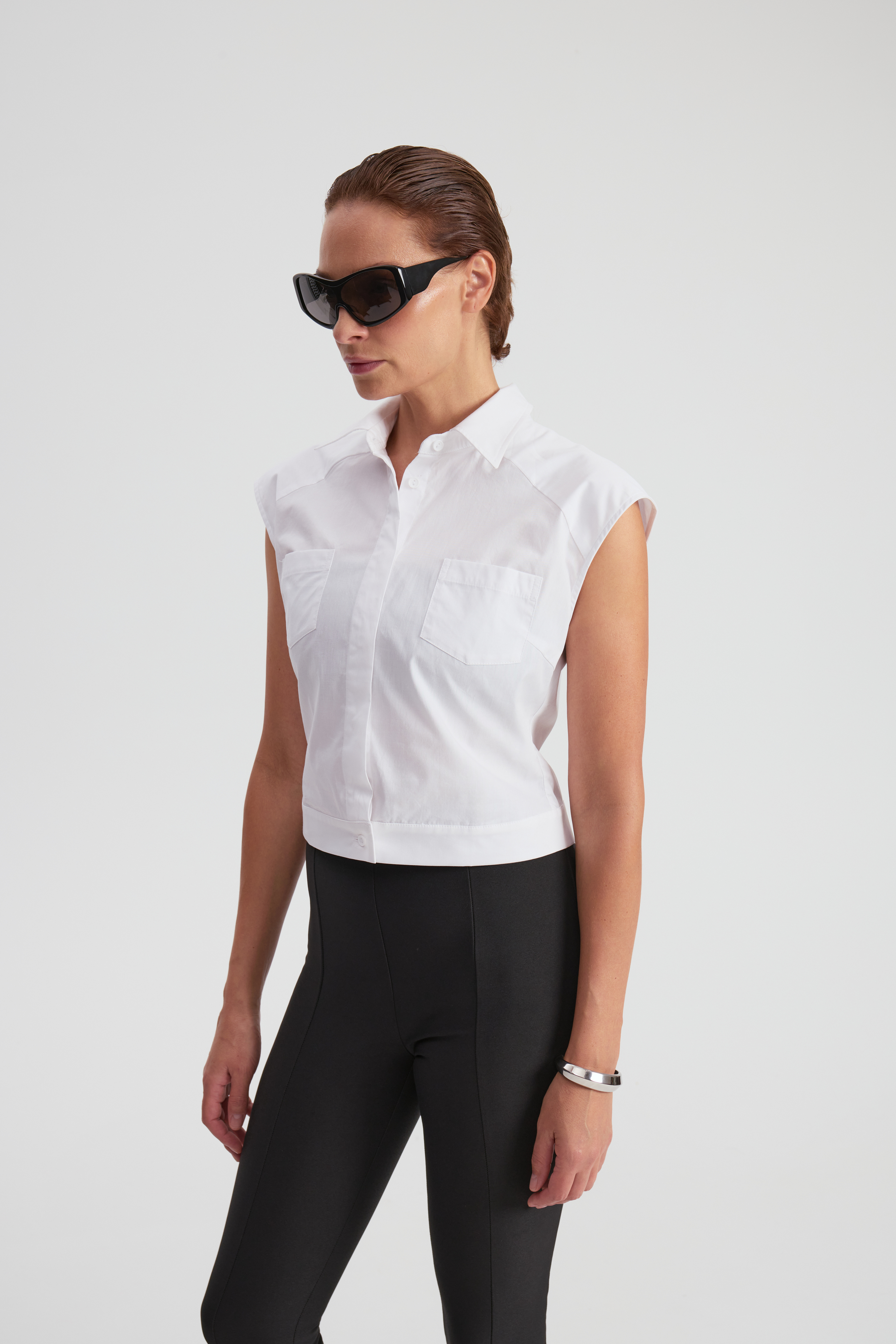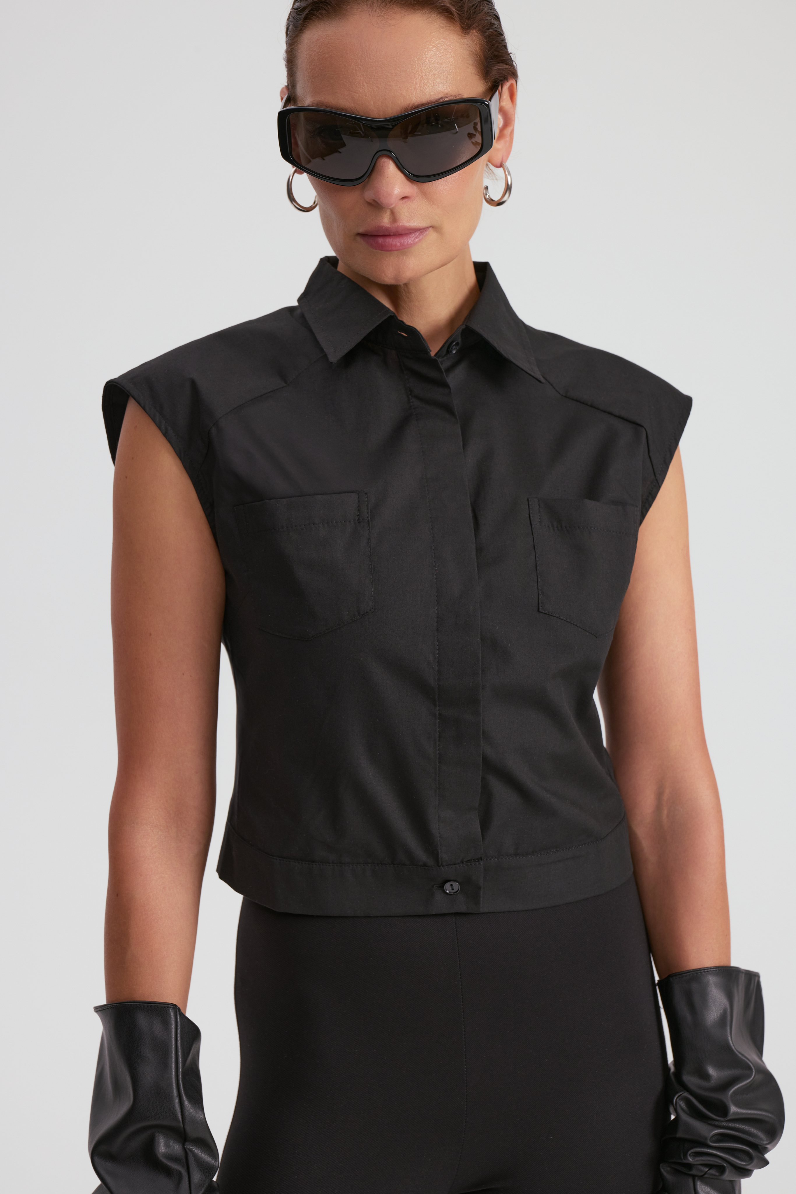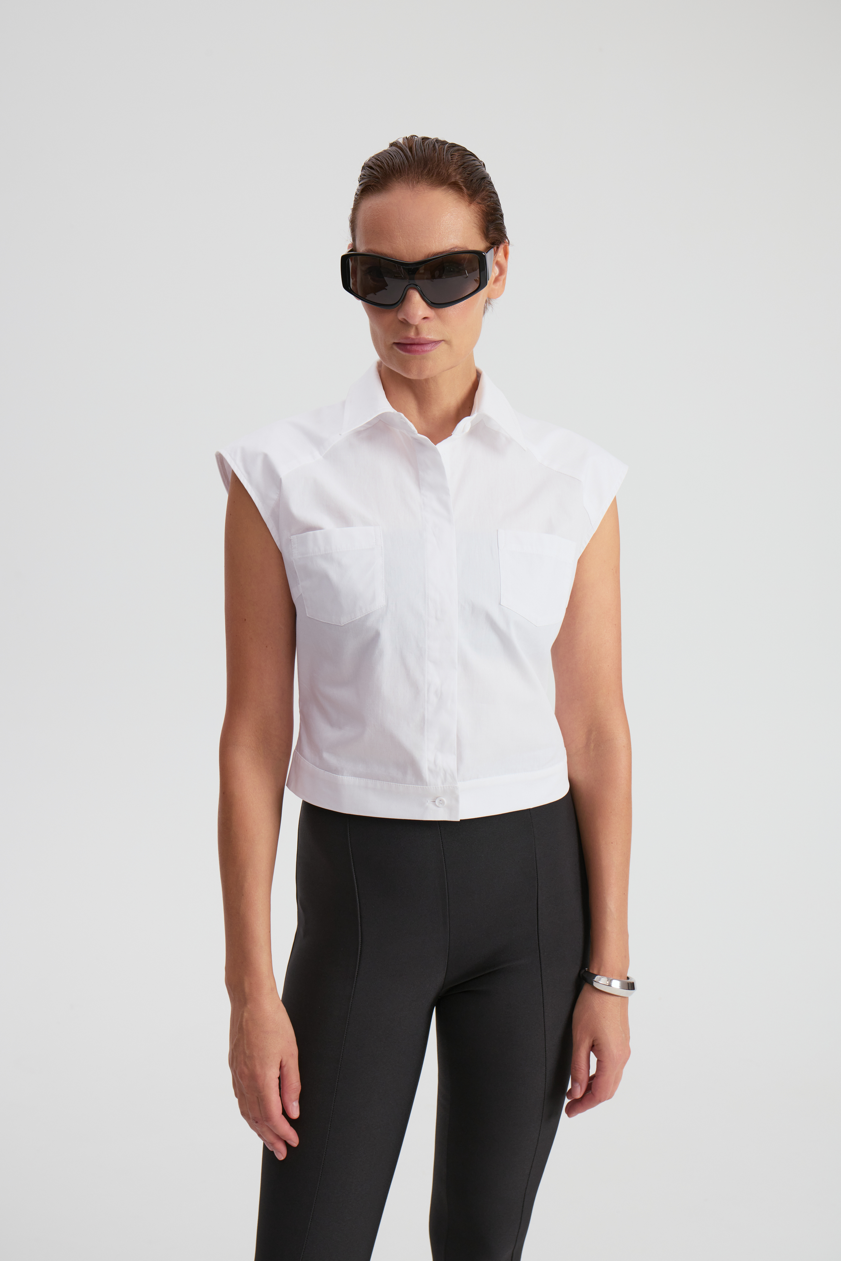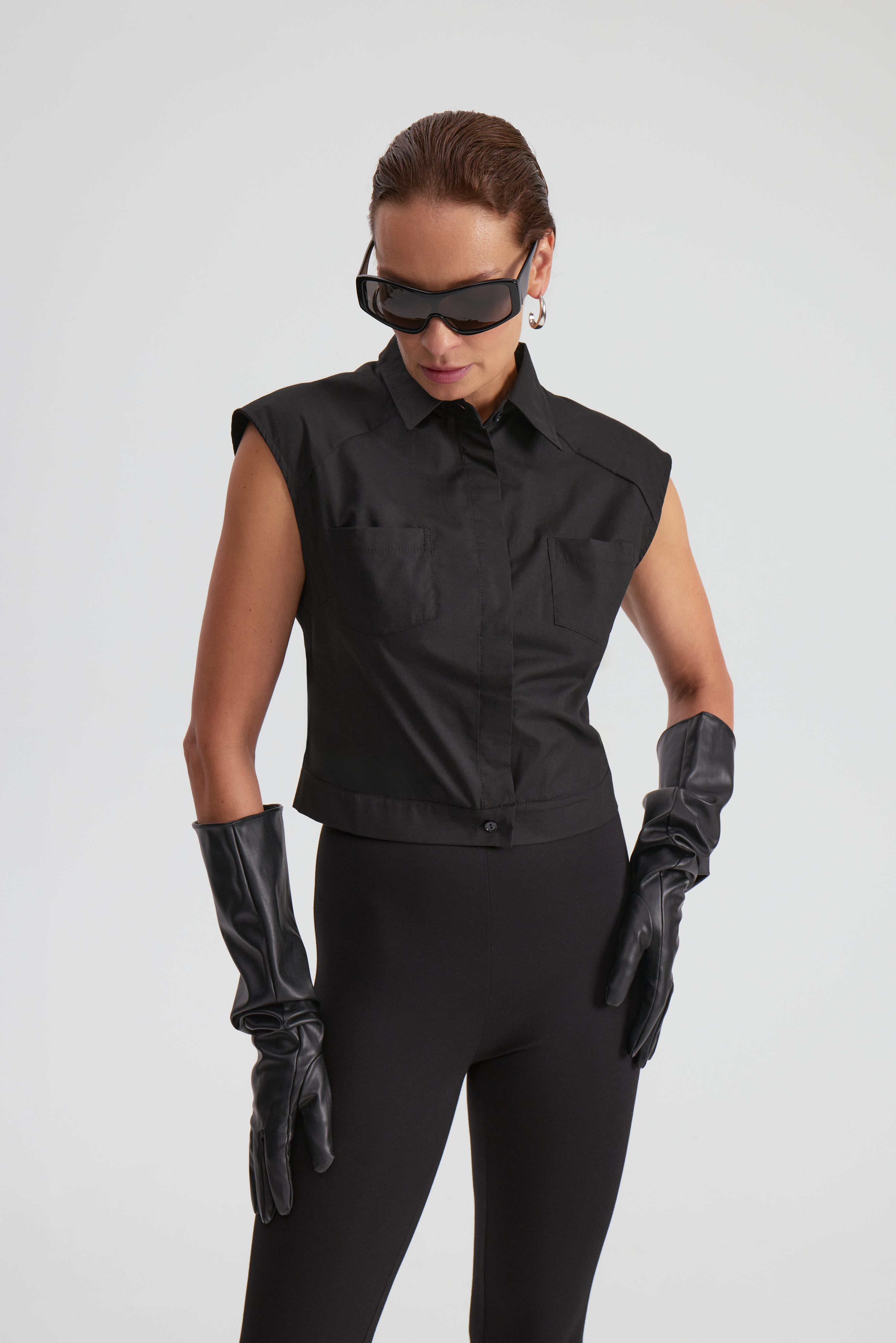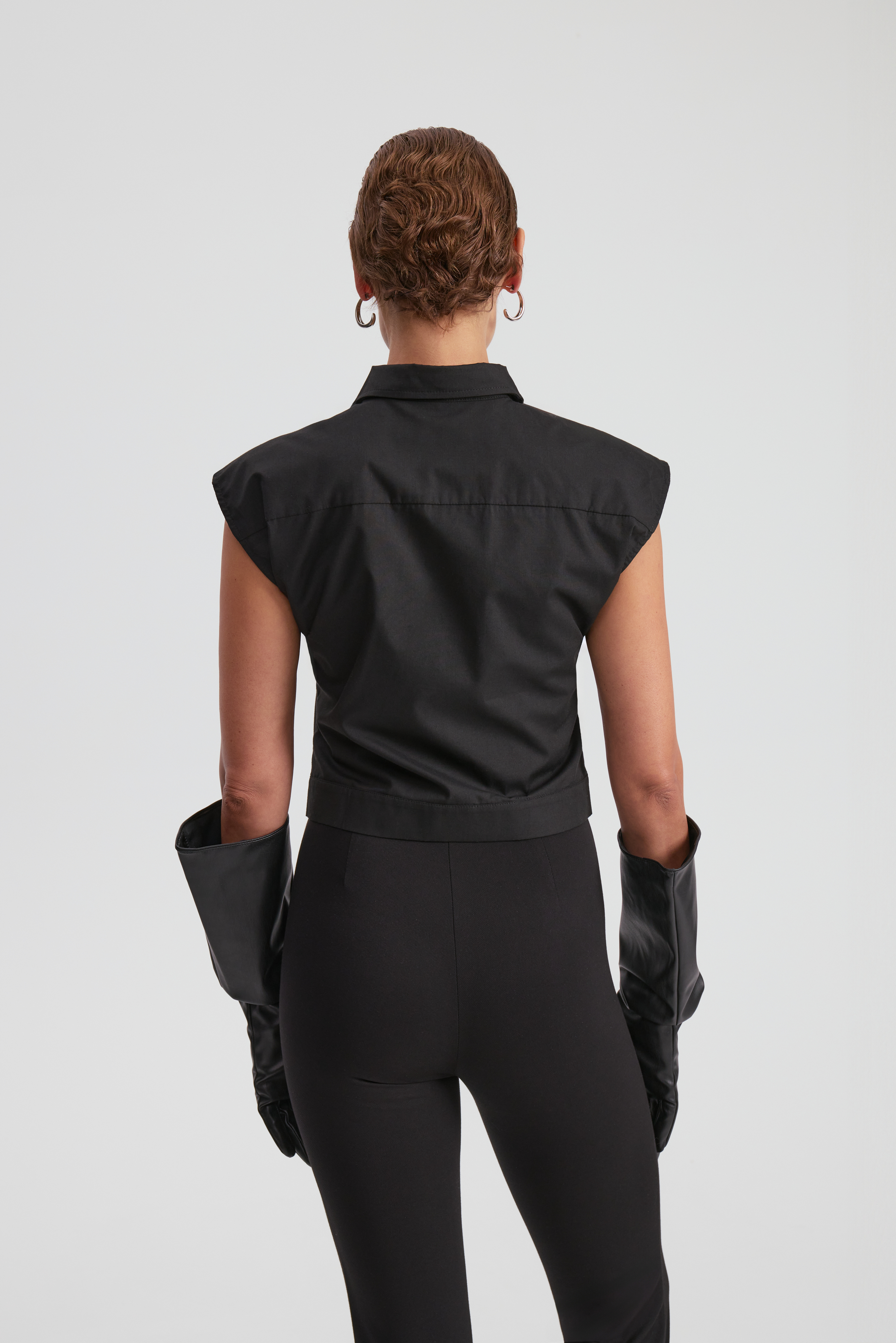 Чёткий силуэт за счёт плотного хлопка и акцентных плеч. Работает как самостоятельный элемент образа. Сочетается с любыми поясными изделиями — от брюк до юбок и денима. Подходит под разные стили и ситуации — от офиса до вечера.