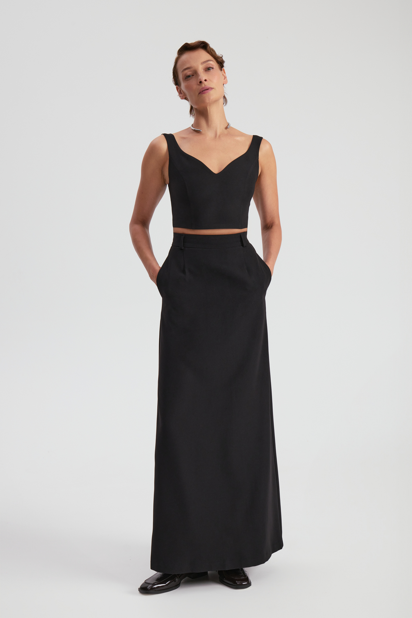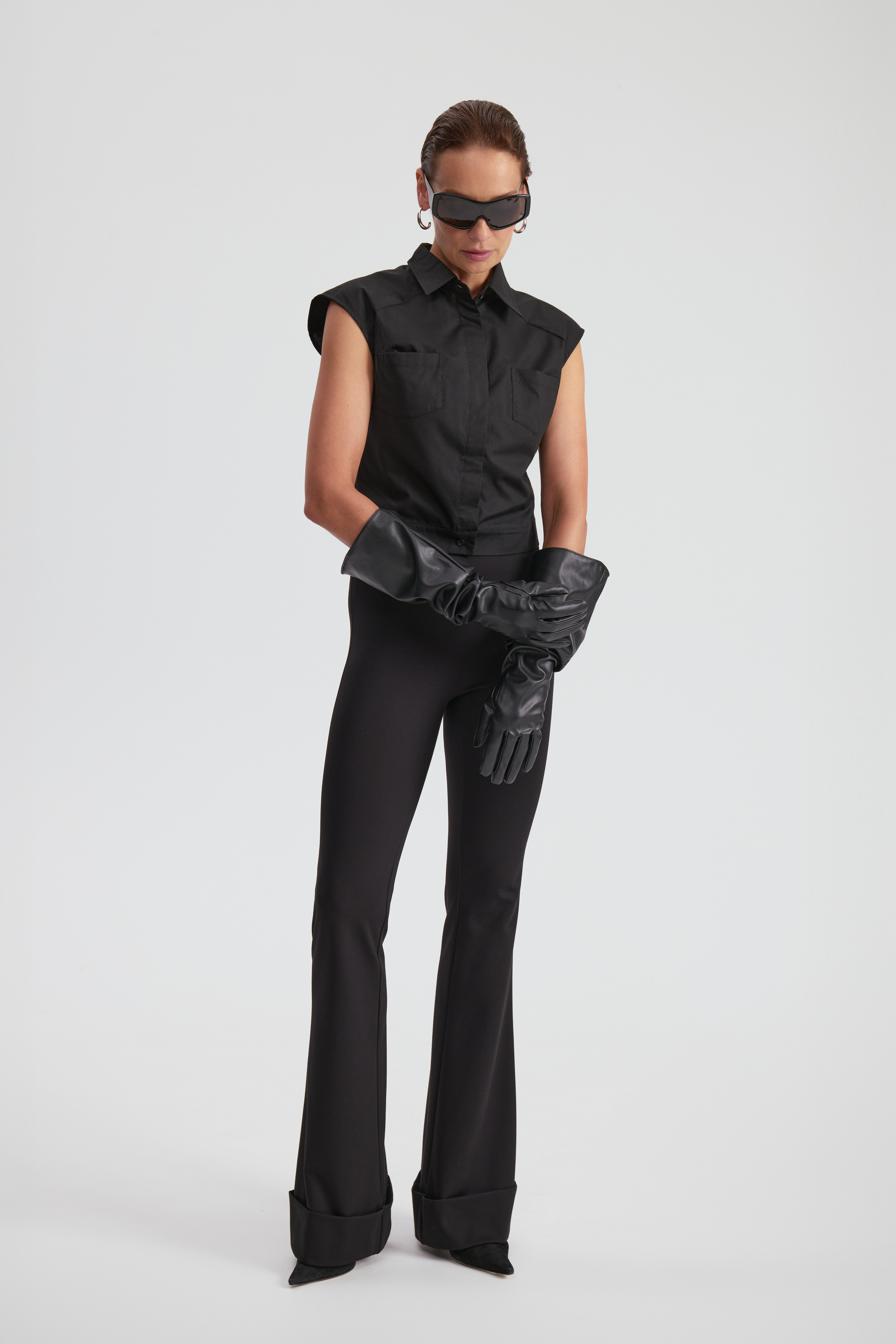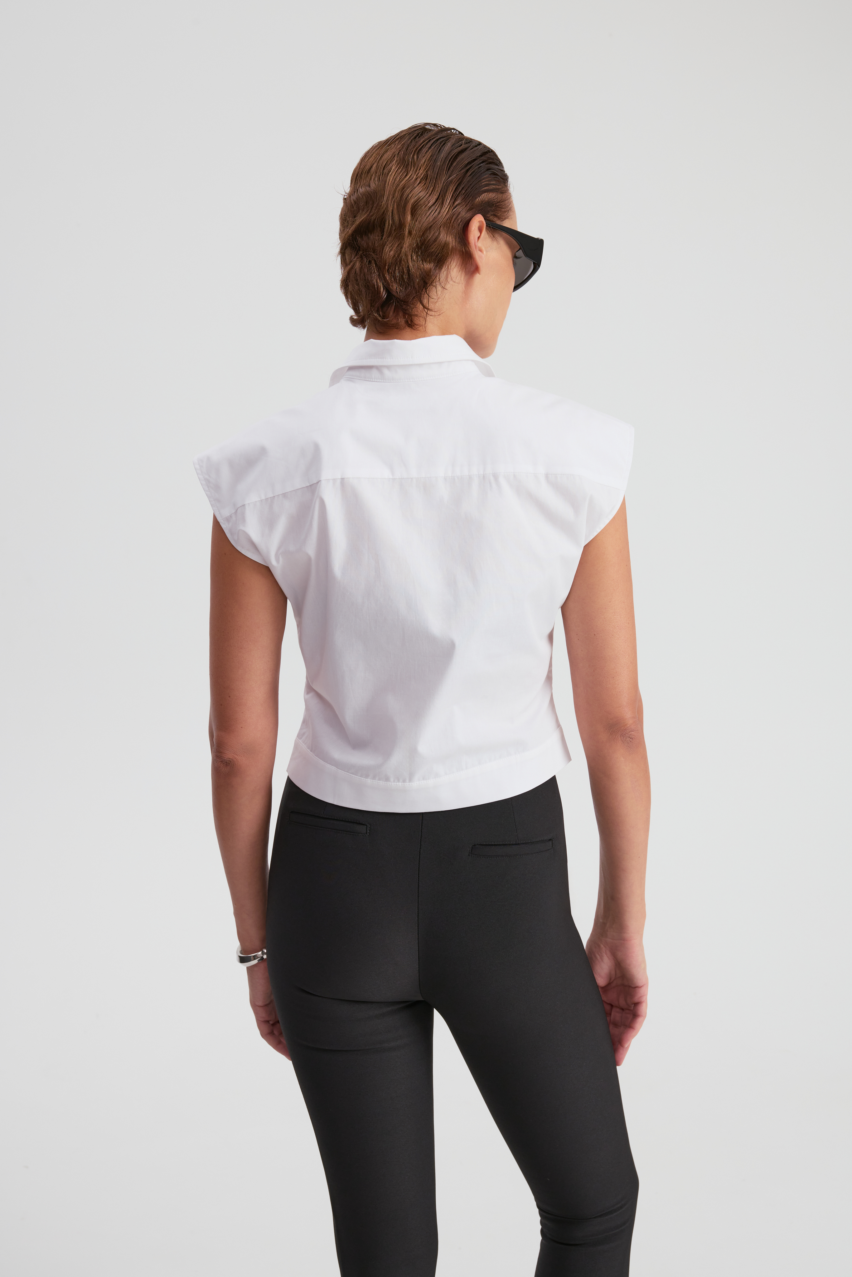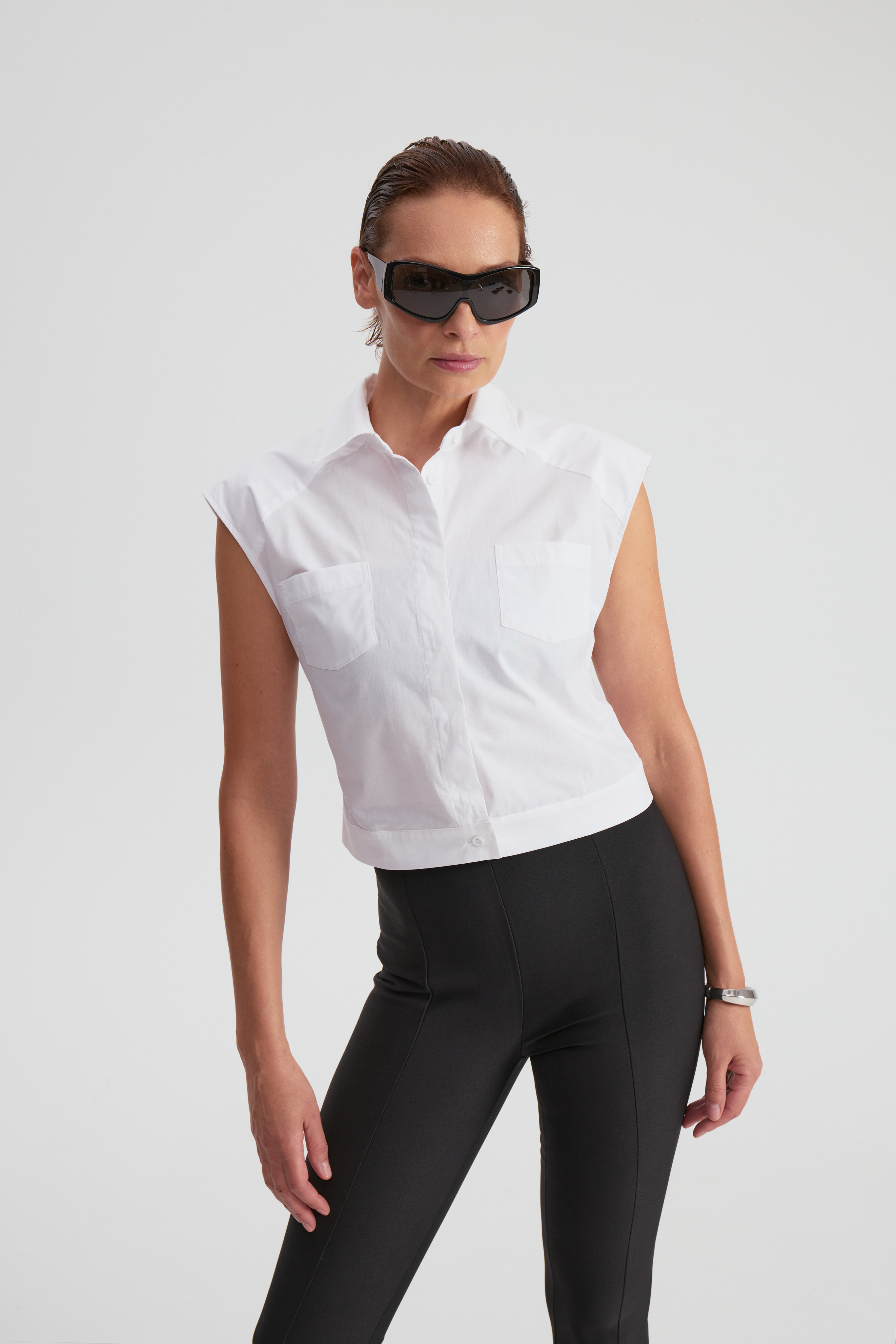 Чёткий силуэт за счёт плотного хлопка и акцентных плеч. Работает как самостоятельный элемент образа. Сочетается с любыми поясными изделиями — от брюк до юбок и денима. Подходит под разные стили и ситуации — от офиса до вечера.